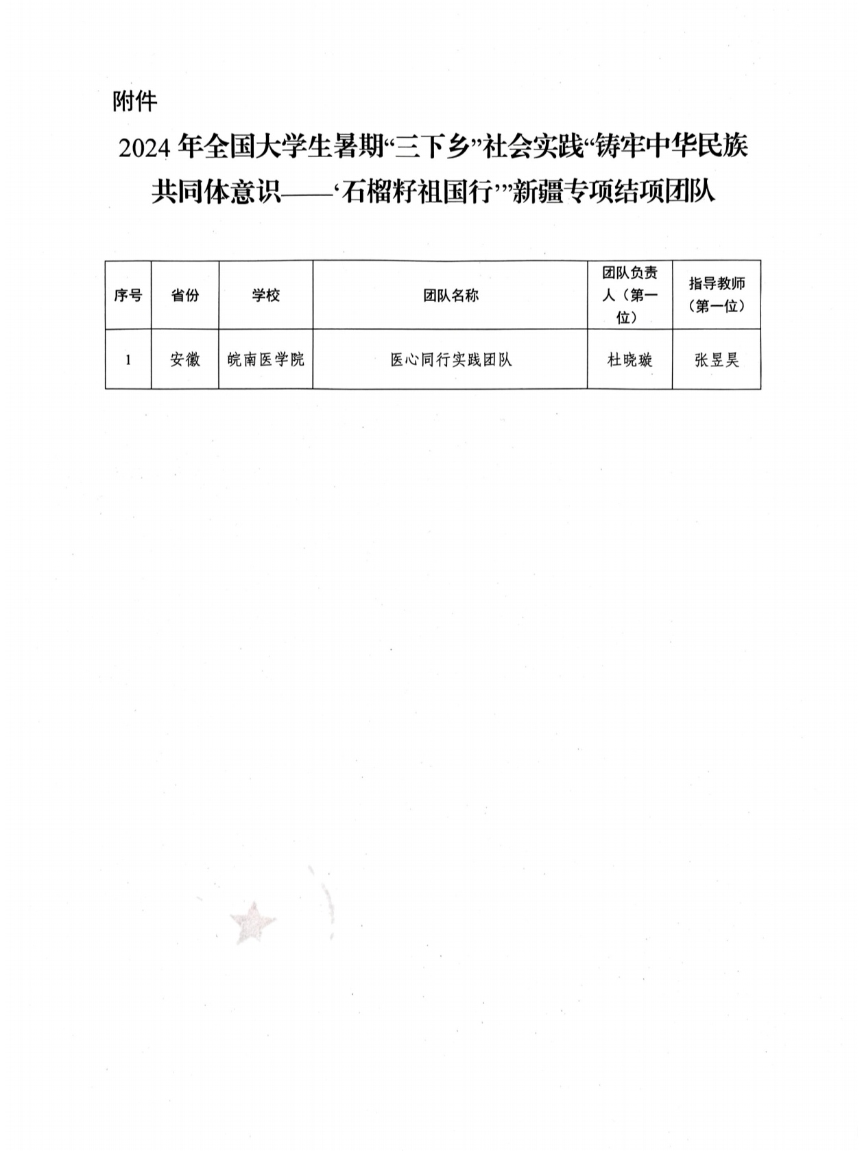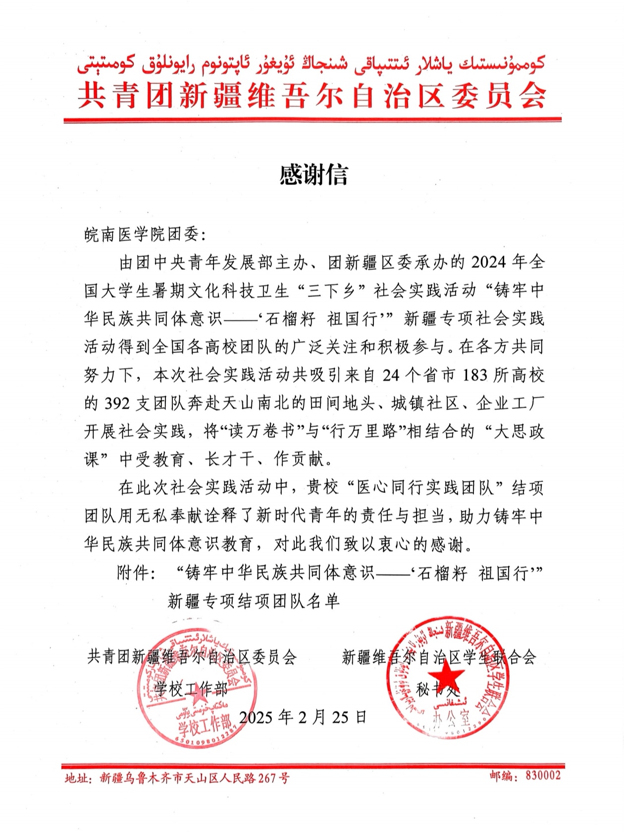 近日,共青团新疆维吾尔自治区委员会向我校团委发来感谢信,对医学影像学院“医心同行”实践团队在2024年全国大学生暑期文化科技卫生“三下乡”社会实践活动“铸牢中华民族共同体意识——‘石榴籽 祖国行’”新疆专项社会实践活动的突出表现予以表扬和感谢。