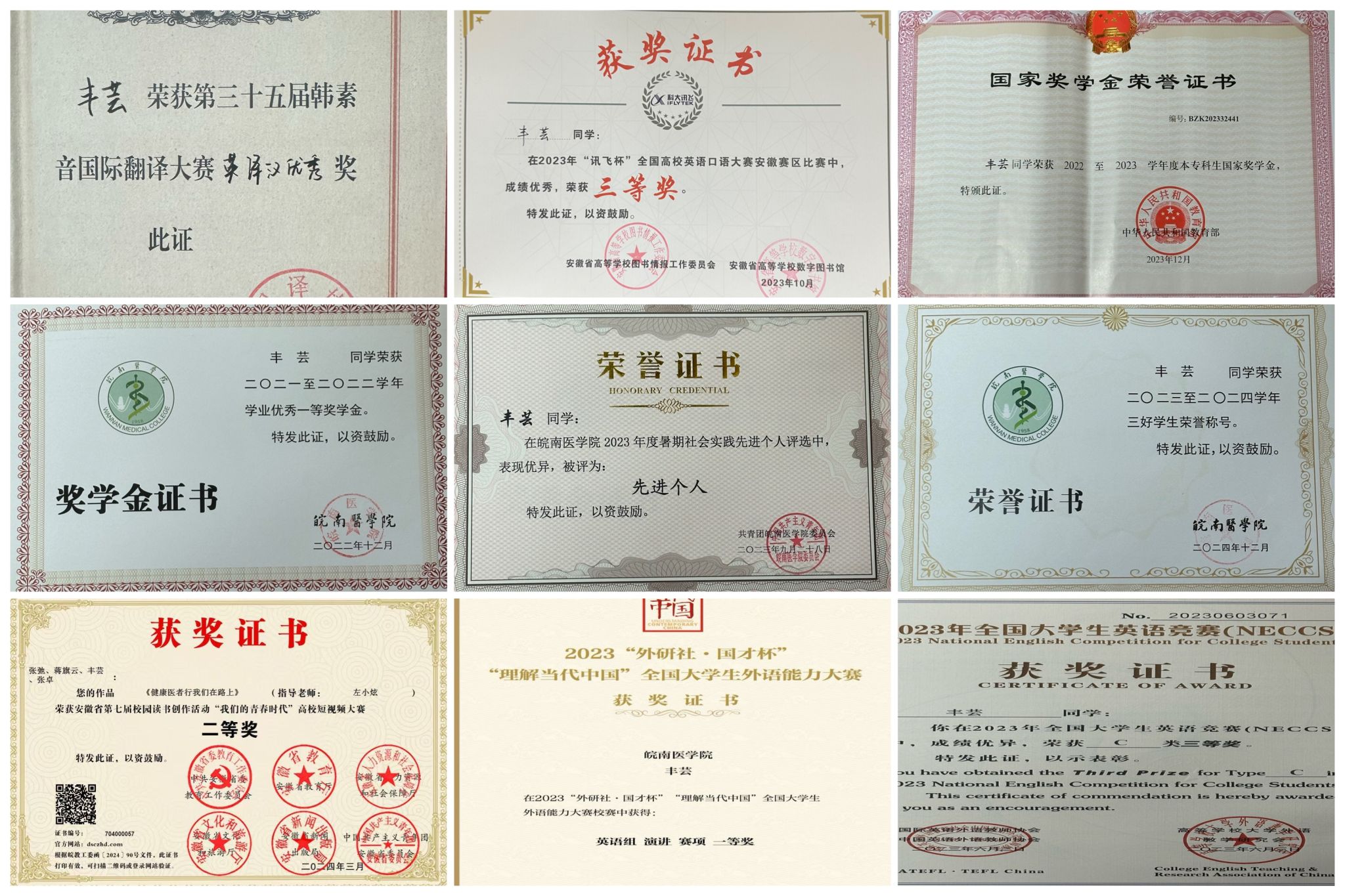 在校期间,丰芸始终保持着对知识的强烈渴望和严谨的学习态度,综合测评成绩连续四年居年级第一,多次获校学业一等奖学金以及单项奖学金,累计获得校级及以上奖项30余次。作为班级团支书,她营造良好的学习氛围,组织成立学习小组,帮助同学们解决学习难题,带领大家共同进步。在提升学业成绩的同时,丰芸还注重自身综合能力的培养,积极参加各类学科竞赛和创新创业活动,获 “互联网 +”“挑战杯” 等赛事省级银奖、校级金奖等奖项,获韩素音国际翻译大赛优秀奖、讯飞杯口语大赛省级三等奖。此外,她还踊跃参与学校的社团活动,曾担任校团委新媒体中心影视技术部部长、院学生会综合部部长,组织开展了一系列丰富多彩的学生活动,丰富了同学们的课余生活,锻炼了自己的组织协调和领导能力。