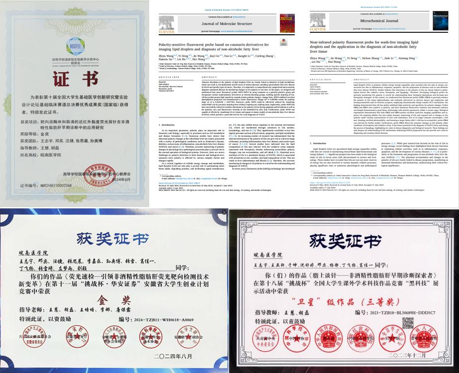 王志宇同学深知科研之路不应局限于实验室的隅角精研,更应将自身成果与社会需求紧密相连,投身科技创新实践的浪潮。三年间,科研已融入王志宇的学习生活,他聚焦社会热点问题,凭借扎实的科研积累,将所学所思运用到具体实践中,不断探索前行。经过不懈努力,他斩获全国“挑战杯”大学生课外学术科技作品竞赛黑科技专项三等奖、安徽省“挑战杯”大学生创业计划竞赛金奖、“全国大学生基础医学创新研究暨实验设计论坛”金奖、“全国大学生药苑论坛”二等奖、“全国优秀论文奖”等国家级奖项5项、省级奖项11项、校级奖项20余项。每一次的竞赛经历,对于王志宇而言都是宝贵的成长契机。在与众多优秀学子的交流切磋中,他博采众长,不断磨砺自身创新思维与实践能力,以无畏的勇气和创新的智慧,向着科技创新的高峰奋勇攀登。他用实际行动诠释着科研创新的价值与力量,展现了新时代青年的担当与风采。