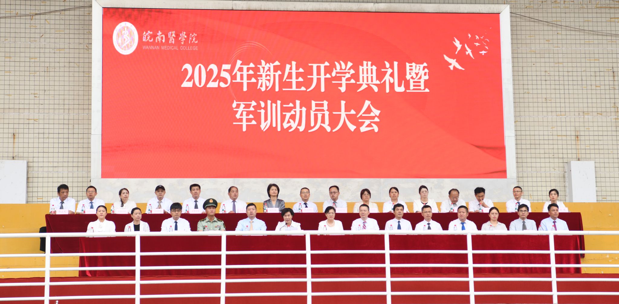 精医报国担使命,迷彩青春启新程。9月11日上午,我校在滨江校区(北区)田径场隆重举行2025级新生开学典礼暨军训动员大会。在校校领导夏劲松、姚应水、贾贤燕、王保中、韩永升、余结根,武警芜湖支队中校参谋长汪洋出席大会。大会由党委副书记贾贤燕主持。