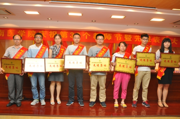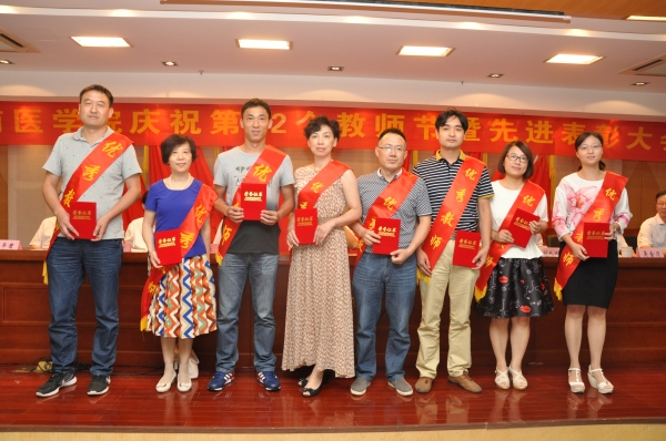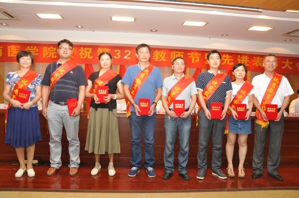 热血丹心育桃李,薪火相传写春秋。在全国第32个教师节之际,我校于9月9日在学术报告厅召开庆祝第32个教师节暨先进表彰大会,对2014/2015、2015/2016两个学年学校优秀共产党员、优秀党务工作者、先进党支部和优秀教师、优秀教育工作者、优秀辅导员、先进集体进行表彰。校领导王先俊、章尧、李刚、刘人人、廖圣宝、吴金月,处级干部,受表彰的先进集体和优秀个人,30年教龄教育工作者,师生代表以及临床(护理)学院代表近300人参加大会。大会由党委副书记、院长章尧主持。