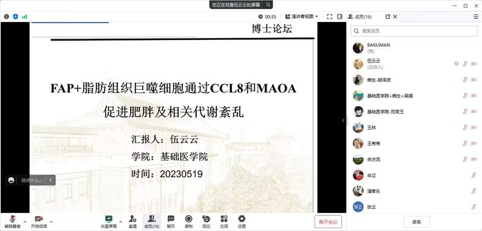伍云云博士主要从事免疫系统组分在代谢性疾病发生发展中的作用机制研究。研究发现了一群特异性表达成纤维细胞活化蛋白(FAP)的脂肪组织巨噬细胞(ATM),FAP上调了ATM表达单核细胞趋化蛋白2(CCL8),促使炎性ATM趋向聚集脂肪局部;并且FAP通过促进炎性ATM表达单胺氧化酶A(MAOA)来降解去甲肾上腺素,进而抑制脂质裂解,导致了高脂饮食诱导的肥胖及相关代谢紊乱。该研究成果旨在从免疫学角度为治疗肥胖及相关代谢性疾病提供新思路,具有很强的临床研究价值与应用前景。整个讲座内容丰富,结构层次清晰,语言生动,给与会者拓展了研究视野,增强了科研信心。