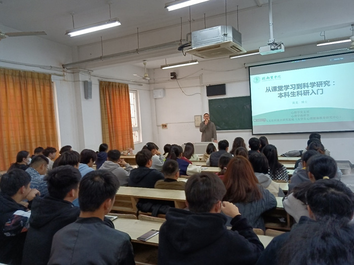 为落实“三全育人”理念,营造良好学术氛围,激发学生开展科研活动的兴趣爱好,11月16日中午,人文与管理学院在赭麓校区1102教室举办“本科生科研入门:从课堂学习到科学研究”主题讲座。讲座由心理学教研室黄龙博士主讲,学院副院长王国平主持,各年级140余名学生参加。
