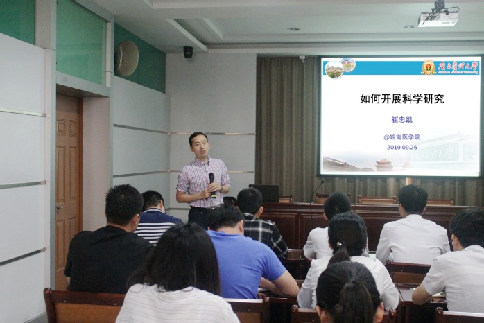 本次博士沙龙邀请了南方医科大学青年学者崔忠凯教授来校进行学术交流。崔忠凯结合自身的科研经历作了题为《如何开展科学研究》的报告。他从树立做科研的决心、确定科研方向、动手做课题、发表科研论文、申请科研基金等方面,介绍了高校青年教师如何开展科研工作,并建议大家要多交流、多读文献,及时掌握前沿动态,积极建立和融入科研团队。同时崔忠凯希望大家重视成果发表,积极大胆申报项目,充分利用现有资源,加强同行交流。整个报告深入浅出、朴实生动、贴近高校青年教师实际。报告之后,崔忠凯教授与在场教师进行了热烈交流,大家表示受益匪浅。