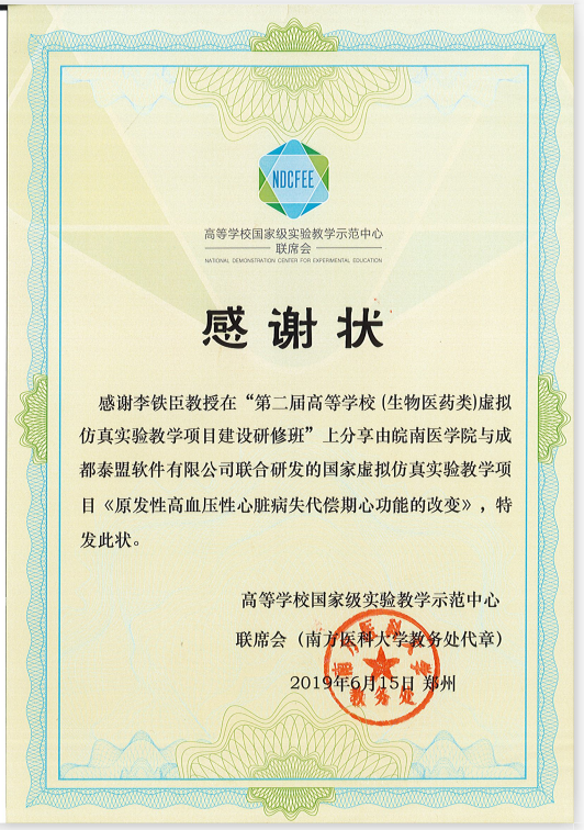 我校2018年获批的国家级虚拟仿真实验教学项目《原发性高血压性心脏病失代偿期心功能的表现》受邀参加案例分享,从三个方面分别介绍了自项目筹备申报开始学校各级领导的关心和帮助,以及项目制作期间团队成员的密切合作,最后简要介绍了项目中虚拟实验模块的操作流程,获得现场专家及各高校代表的一致好评,并被授予感谢状。